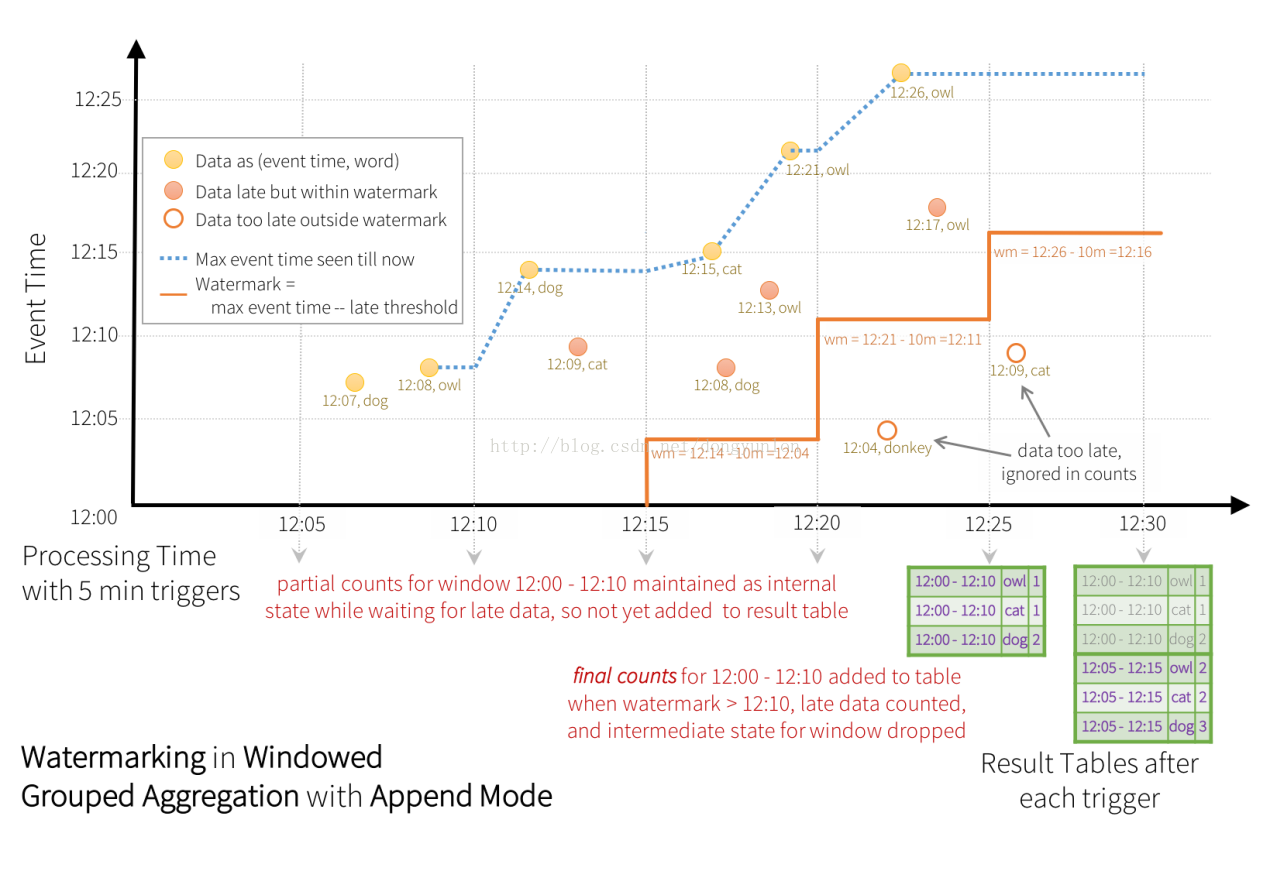 (1) Append mode (default) -这是默认模式,只有从上次触发后添加到结果表中的新行将被输出到接收器。只有那些添加到结果表中的行从不会改变的查询才支持这一点。因此,该模式保证每行只能输出一次(假定容错sink)。例如,只有select,where,map,flatMap,filter,join等的查询将支持Append模式。