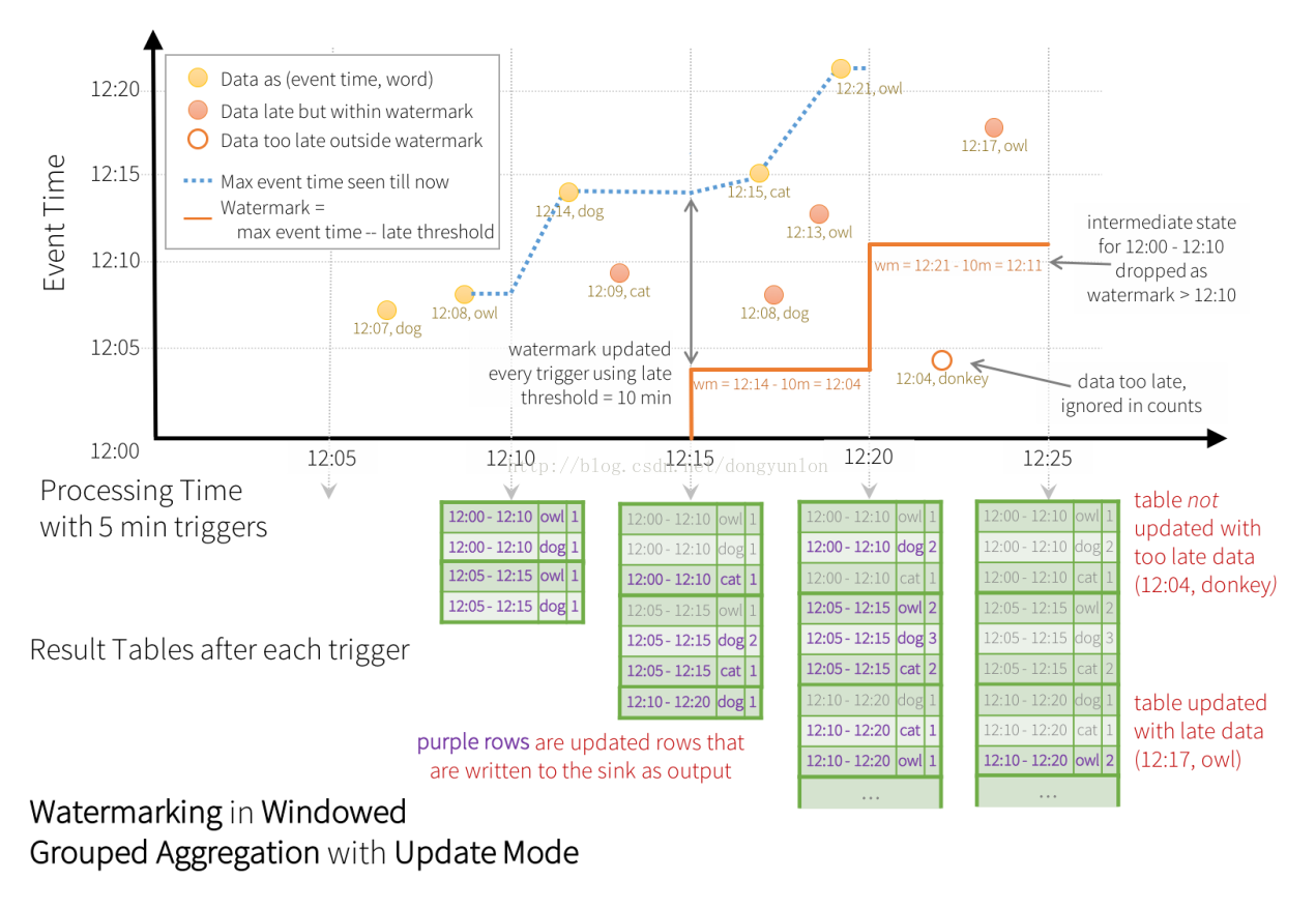 3:Update Mode – 当时间间隔触发时,只有在Result Table中被更新的数据才会被写入外部存储系统(在Spark2.0中暂时尚未可用)。注意,和Complete Mode方式的不同之处是不更新的结果集不会写入外部存储。如果查询不包含aggregations, 将会和append模式相同