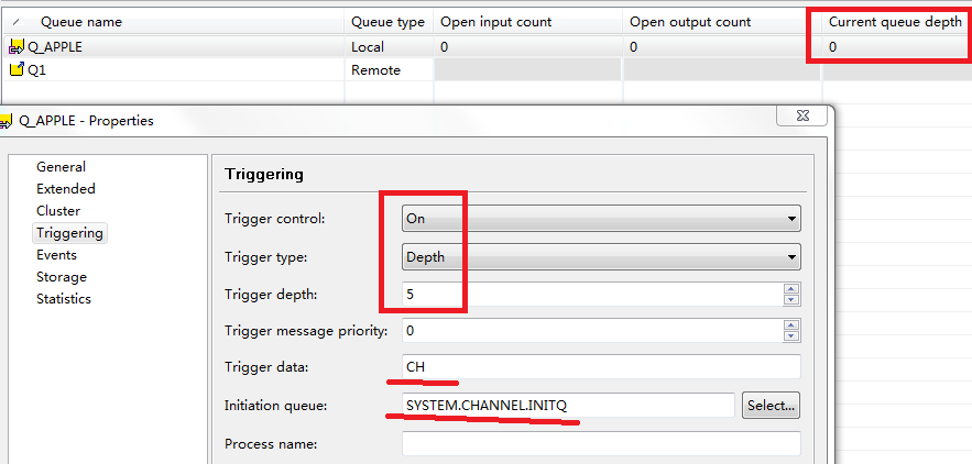 为了更加深入理解trigger的使用,在一个远程队列架构的发送端传输队列中配置了一个基于深度的trigger,触发深度为5。如图: