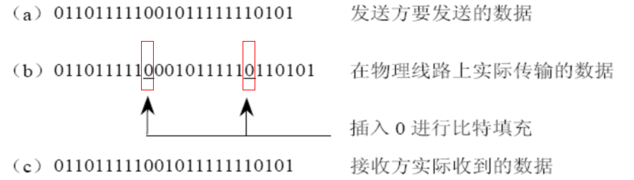 所以发送方在传输的数据段中碰到 5 个连续的 1 时,就自动在其后面填充一个 0 ;在接收方接收数据时,每收到连续的 5 个 1 就删除后面跟着的 0 。