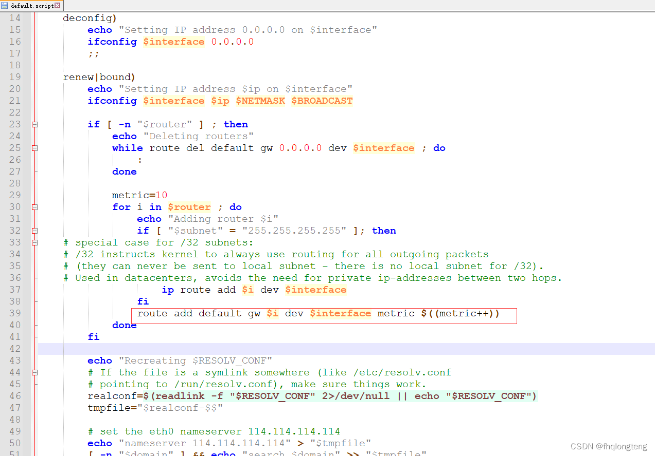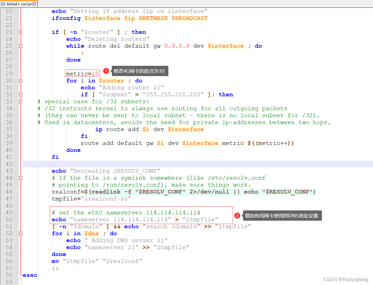通过分析quectel-CM的程序代码,关于ip与路由的设置是由default.script文件来实现的,所以修改4G卡的跃点为10, 由于4G网卡获取 dns服务器后改resolv.conf文件时,保留原来的有线网卡使用的dns。