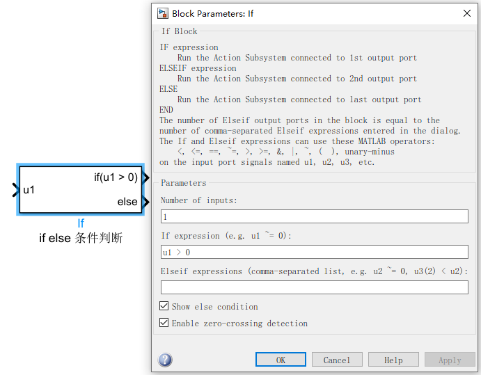if模块,就跟我们写python和其他语言的if一样,作用就是对输入的变量是否符合判断条件。满足条件则在if接口输出一个子系统的触发信号,不满足条件则在else接口输出一个子系统的触发信号。