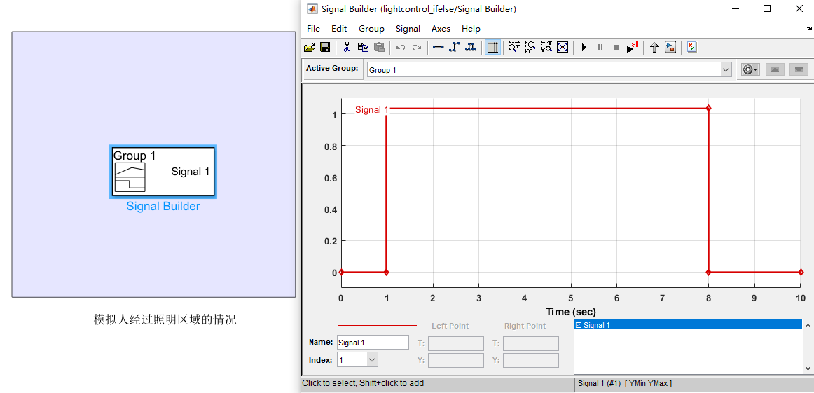 编完了我们就来仿真试一下,首先人工生成一个这样的信号,里面包含一段人进入然后离开的信号。使用Signal Builder编写: