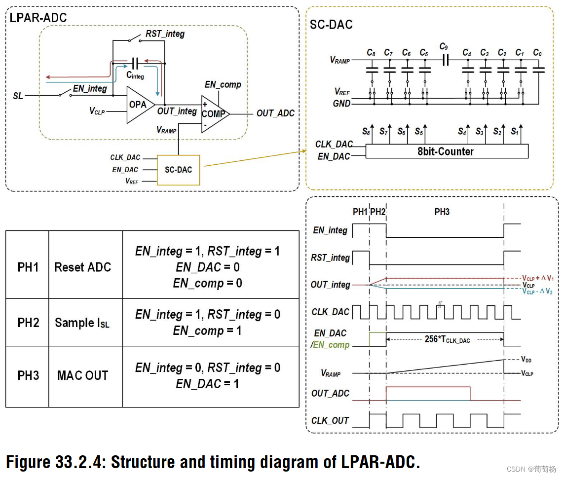 图33.2.4展示了LPAR-ADC的结构和时序图。LPAR-ADC包含3个子模块:一个积分器,一个比较器和一个分段电容(SC-DAC,segmented-capacitor)积分器包括一个运算放大器和一个积分电容。积分器将SL钳位到V-CLP并将SL电流转换为一个模拟电压信号。SC-DAC产生一个从V-CLP到V-DC的斜坡电压,比较器被用于比较斜坡电压信号和积分电压信号。ADC的工作流程包含3个阶段:(1)PH1:通过设置RST-ineg/EN_INTEG开关开启,EN_DAC/EN_comp开关关闭来初始化ADC,在这个阶段,SL和V-RAMP保持初始电压(V-CLP);(2)PH2:采样I-SL,在这个阶段,RST_integ开关关闭,Cinteg与SL电流连接。从SL和OPA流过的电流在电容上进行积分。OUT_integ电压随后被改变,HN_comp开启给比较器预充电;(3)PH3:乘累加输出,在这个阶段,EN_integ关断来关闭SL电流读通路;与此同时,OUT_integ电压保持不变;SC-DAC开始计数并产生斜坡脉冲电压信号。比较器比较积分器的输出和SC-DAC,产生一个脉冲,如图33.2.2所示,LPAR-ADC的功耗被积分器的参考电流源和比较器所控制,ADC精度通过配置采样时钟的频率控制。值得一提的是积分和量化方法可通过对积分时段的累积电流I-SL进行平均从而滤除电流过冲和波动。量化输出使得瞬态错误最小化。