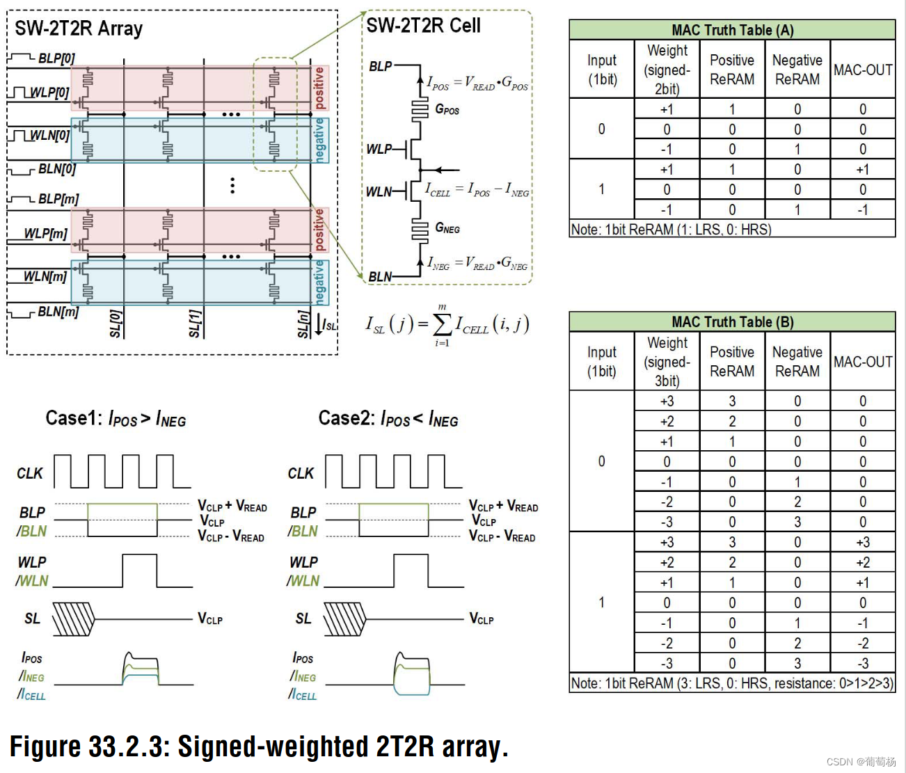 图33.2.3展示2T2R阵列的结构、工作时序图和真值表。在一个SW-2T2R单元中,2个ReRAM代表正负权重,在推理过程中对其施加极性相反的电压。如果VSL=V-CLP,VBLP=V-CLP - V-READ,VBLN=V-CLP+V-READ,则G-POS和G-NEG分别代表不同的权重,为正、负或0权重。SL电流描述流过正单元和负单元权重电流的差值,根据I-CELL =V-READ*W-CELL,电流与W-CELL成比例,2T2R结构通过提升存算精度从两方面降低IR drop:(a)如果G-POS = G-NEG,电流I-CELL为0;(b)通过正权重和负权重的电流在同一列可被原地消除。ReRAM精度决定了SW-2T2R单元的精度,图33.2.2的真值表中有展示。基于ReRAM的权重通过器件的中间态被定义。如果单个ReRAM器件可表示1bit(2级)或2bit(4级),SW-2T2R的权重精度是有符号的类2bit(3级)或者有符号的类3bit(7级)。根据对同一个ReRAM的片外测试,器件电导可被连续调制。然而,片上的ADC精度限制了片上ReRAM的电导最多被量化为256个状态。