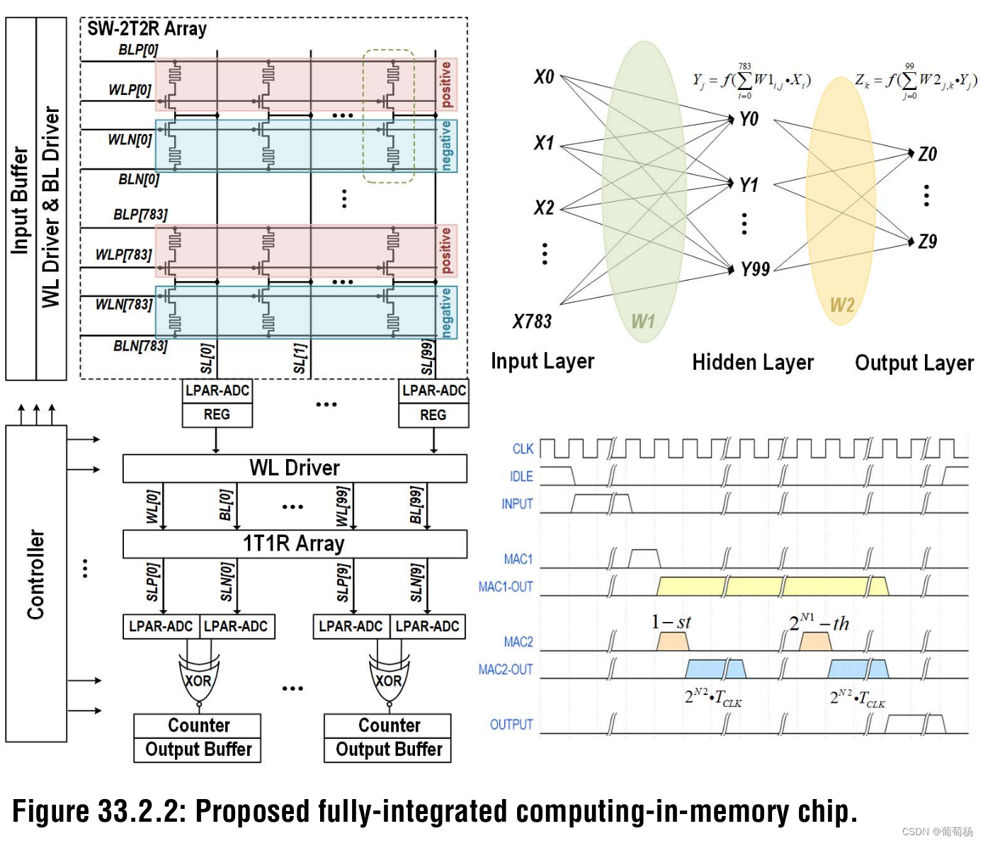 图33.2.2展示了本文提出的存算芯片的算法、结构以及工作流程。本文实现了2层感知机模型,包含2个全连接权重阵列和三个神经网络层。芯片结构包含一个SW-2T2R阵列,一个1T1R阵列,输入输出缓存器,LPAR-ADC等等。一个差分对连接的正负权重连接到同一个输出列,与参考文献【2】【3】不同;一个x-bit的权重(1-bit符号,x-1-bit数据)存储到SW-2T2R单元。,在n个并行乘累加运行期间,n个LPAR-ADC钳位SL电压为VSL-CLP,将SL上的电流转换为数字输出,SL电流是同一列所有SW-2T2R单元电流的累积结果,每个乘累加结果评估了一个m维1bit的输入向量与x-bit的有符号权重的乘积结果。LPAR-ADC的输出被存储到寄存器中并被采样到下一个ReRAM阵列作为输入。通过改变采样时钟的频率,LPAR-ADC的频率可调。接口模块的可灵活配置是为了实现系统精度和功耗之间的折中。第二个ReRAM阵列的输出(MAX2-OUT)被计数器采样后存储到输出缓存上。如果第1级的ADC精度为N1bit,则会产生2的N1次方个脉冲;同样的,如果第二级ADC的精度被设置为N2bit,对于第1级的输出,第2级的输出生成2的N2次方个脉冲,因此,一个图像的推理时间至少持续2的(N1+N2)次方的时间,一个更高精度的ADC分辨率会导致更好的系统识别精度,然而也会消耗更多的能量和延时。