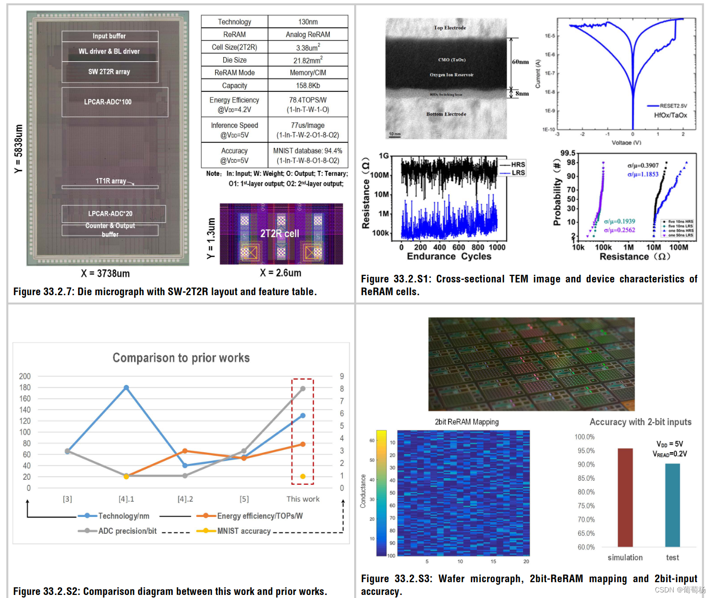 图33.2.7展示了芯片的显微照片、SW-2T2R单元的版图以及参数特征表。总的来说,本文在130nmCMOS工艺上实现了158.8Kb的ReRAM芯片,一个完整的多层神经网络模型首次完全集成在存算芯片中,并以77us/图像的高速实现了MNSIT数据集,实现了78.4TOPS/W的峰值能效和94.4%的测试精度。