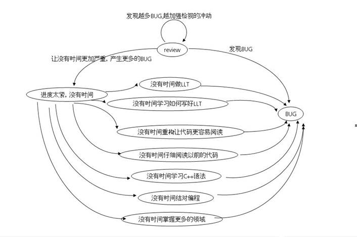 加强REVIEW --> 发现问题 --> 占用了时间 --> 更没有时间做测试等等 --> 生产更多的问题 --> Review会发现更多的问题 -->大家认为Rvreview很有效果 -->大家会用更多的时间Review --> 于是产生更多的BUG^^^^^^^^^^