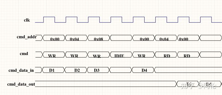 在控制寄存器接口上,需要在每一个时钟解析cmd。当cmd为写(WR)指令时,需要把数据cmd_data_in写入到cmd_addr对应的寄存器中;当cmd为读指令(RD)时,即需要从cmd_addr对应的寄存器中读取数据,并在下一个周期,将数据驱动至cmd_data_out接口。