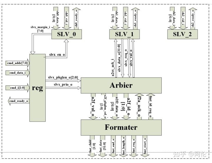 - 仲裁器(Arbiter)可以选择从不同的FIFO中读取数据,进而将数据进一步传送至整形器(formatter)。
