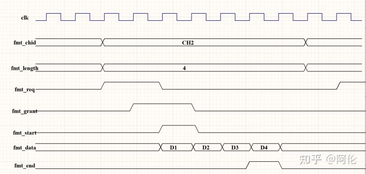 - 相邻的数据包之间应该至少有一个时钟周期的空闲,即fmt_end从高位被拉低以后,至少需要经过一个时钟周期,fmt_req才可以被再次置为高。