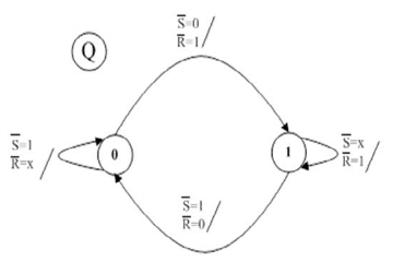我们仔细分析上面的与非门触发器的真值表,存在两个真值表,右侧的是简化版本。真值表中的不确定是指两个输入0同时变为1时,输出是不确定的。如果只是两个输入为0,那么输出是确定的,均为1.借着上面的一句话我们来依照真值表列出次态的表达式,还是采用最小项的方法,经过化简后,与非门触发器的的状态转移表达式就能得出,没有问题。这也说明一点,只要有真值表,那么写出逻辑函数的表达式是没有困难的。