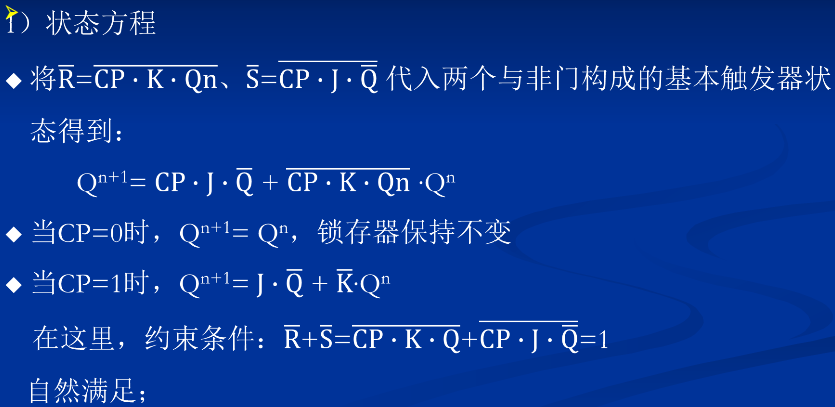 当CP为1的时候,门控电路没有起到作用;当CP为0的时候,门控的电路的两个输出为1,基本触发器的状态就保持不变。换句话说,当CP为1的时候,锁存了为1的前一刻触发器的状态,这就是使用锁存器的目的。这个锁存器的约束条件和之前基本触发器的约束条件不太一样。基本的R'S'触发器的约束条件是两个输入端R'S'至少有一个为1,但是锁存器中有一个与非门控制电路,也就是锁存器的R,S输入中要有一个为0,(在CP为1的情况下)即RS=0.同前述的基本触发器一样,锁存器也有状态转移方程,状态转移真值表,状态转换图,时序图。所有描述锁存器的方法都要加上CP部分.