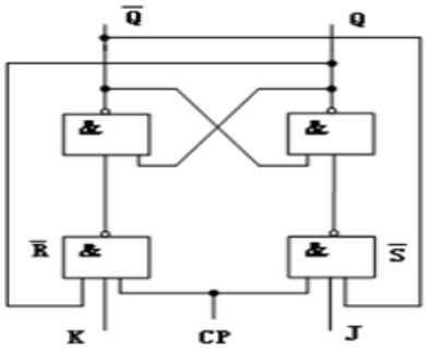 由两个与或门的基本触发器构成,CP是门控,D是数据端,分成两条线对应于与或门基本触发器的输入,S=D,R=D'。
