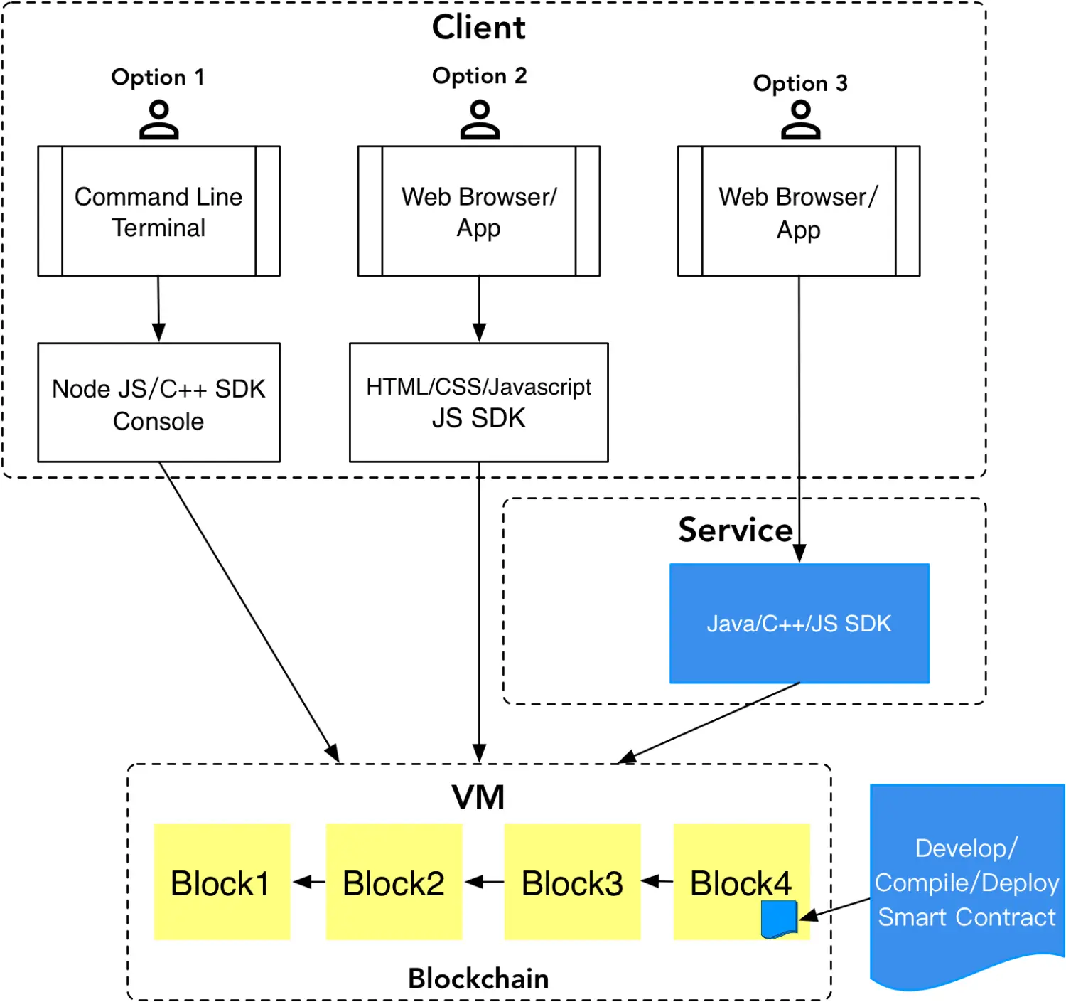 - 选项 3:与传统 Web 应用开发相似,访问后端服务(Service),后端服务集成 SDK 后与区块链合约平台交互。该方式适合与传统的业务系统相结合,在后端服务层实现一些比较重要的业务逻辑和计算任务。