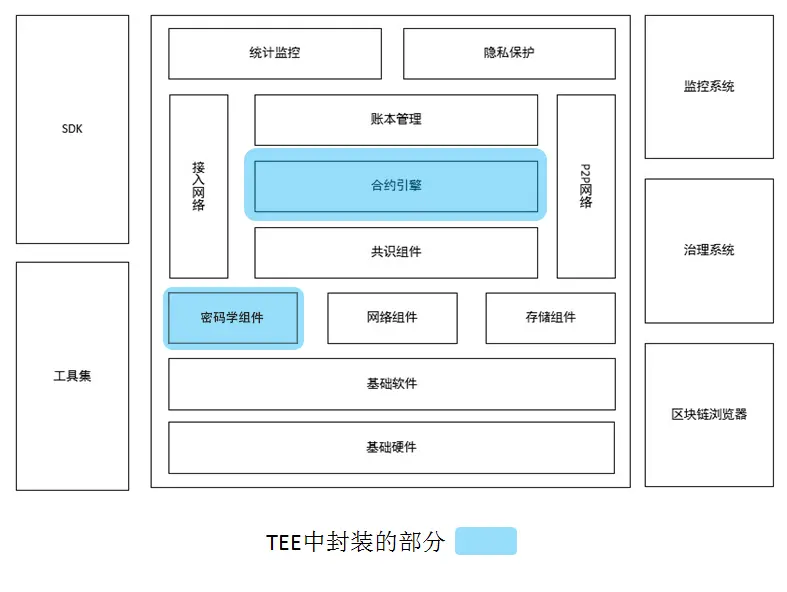 TEE 硬件隐私合约链是在标准合约链功能基础上采用TEE硬件叠加隐私保护相关功能。