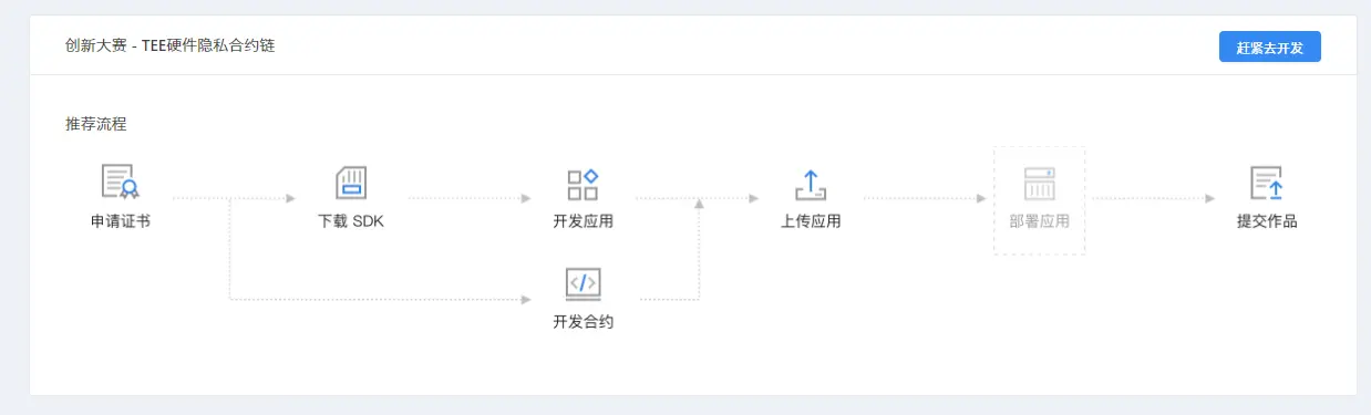 (1)选择区块链创新大赛主页面的“创新大赛 - TEE硬件隐私合约链”的模块,点击“赶紧去开发”按钮。