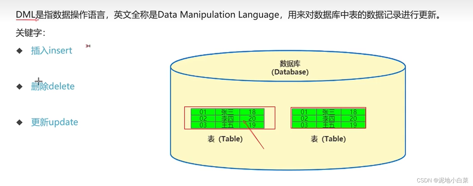 1.基本介绍:DML是指数据操作语言,英文全称是Data Manipulation Language,用来对数据库中表的数据记录进行更新