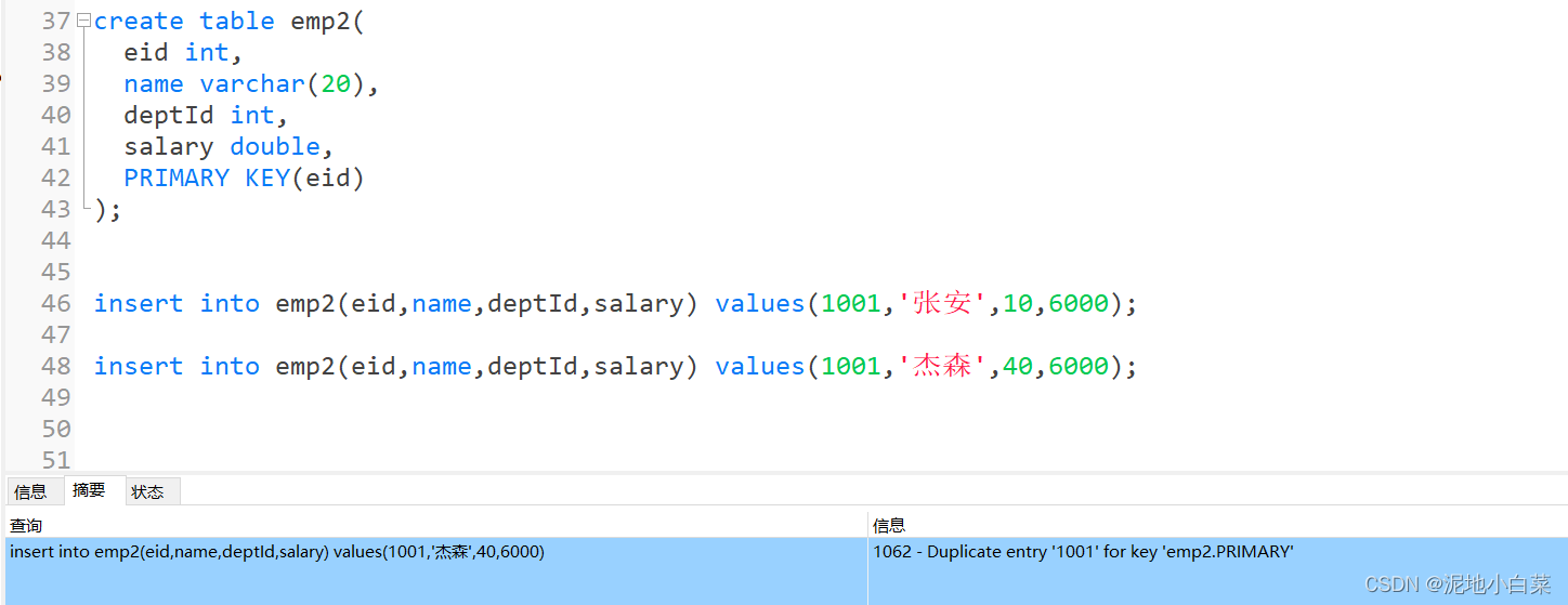 当个一个列设定主键之后,如果之后相同列插入相同的列值就会报错,报途中摘要信息部分的错误
