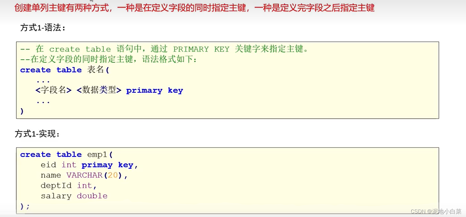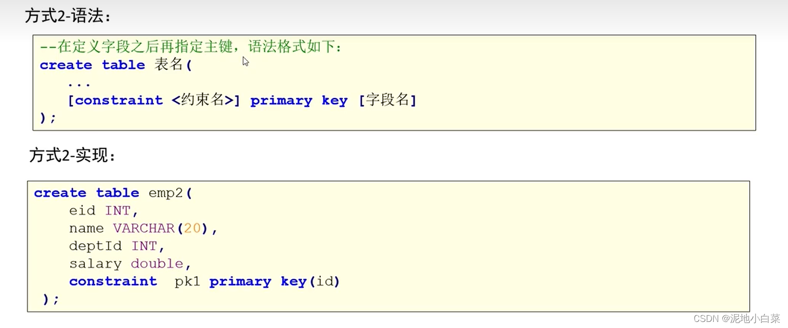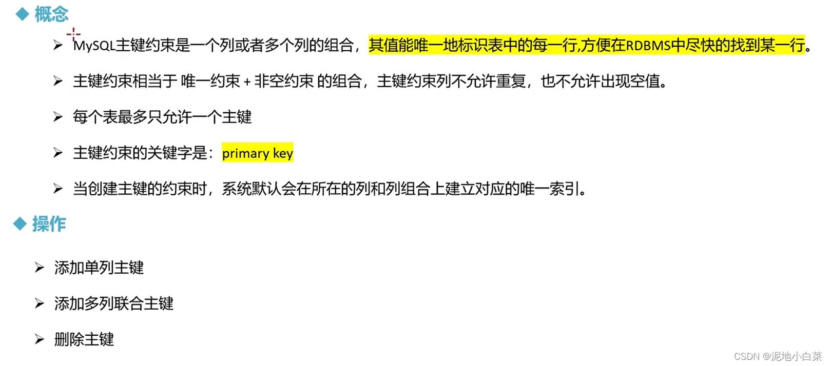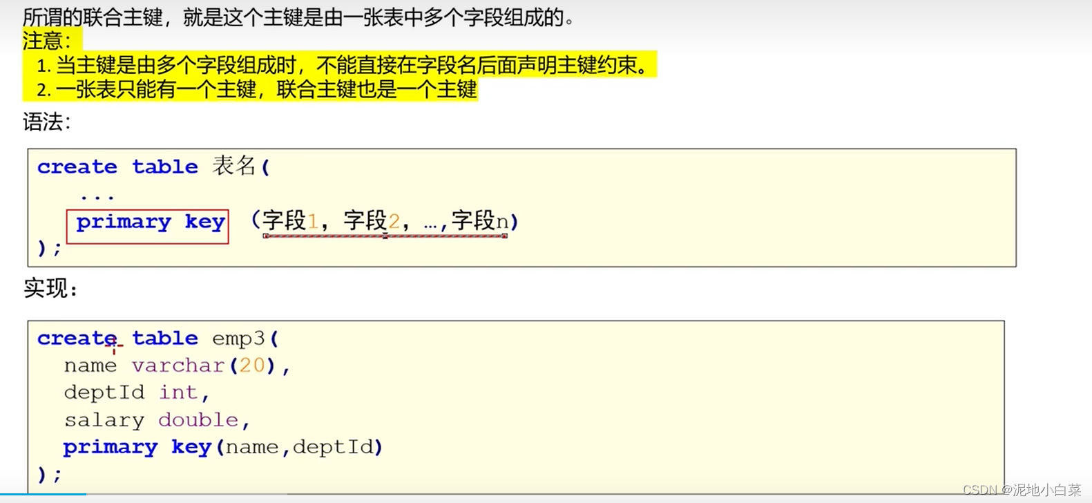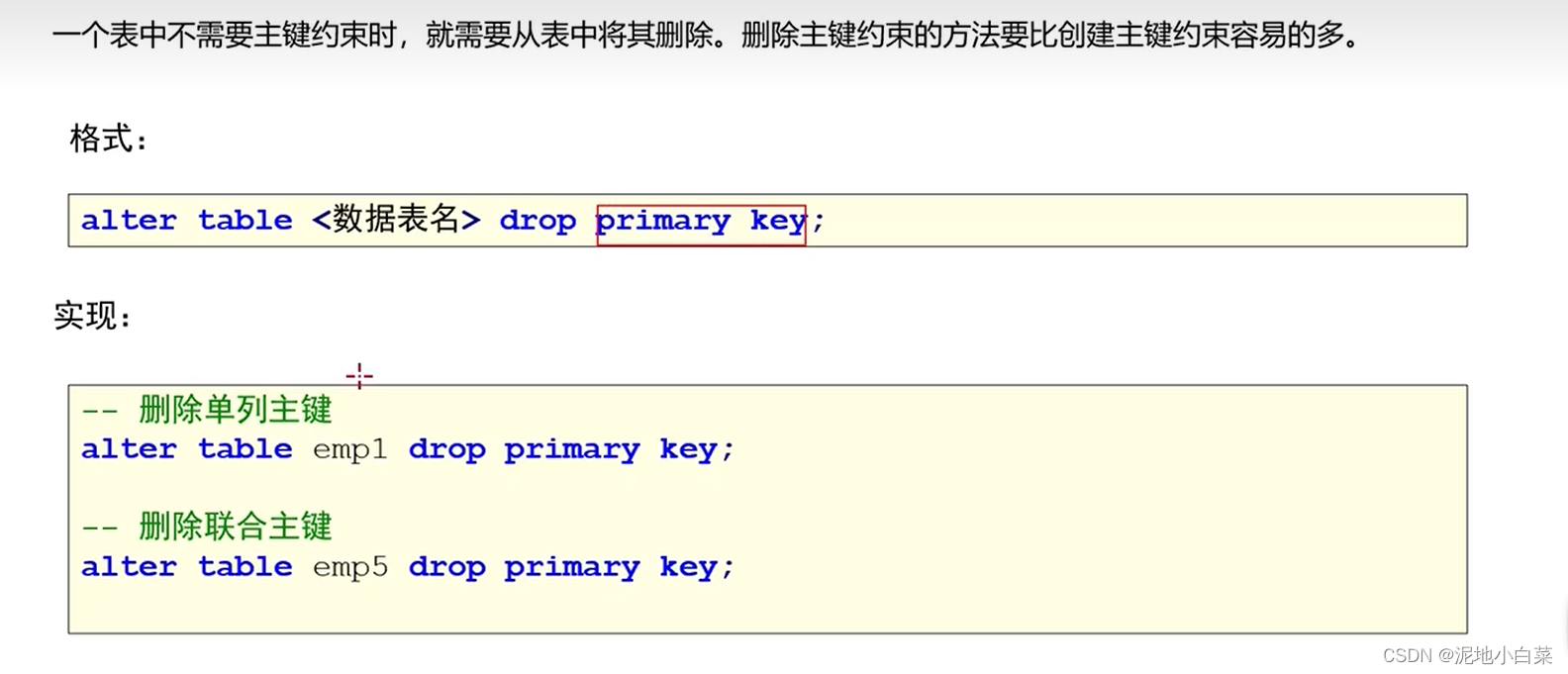 删除单列和联合主键都是一样的语法,因为主键只有一个,联合主键也只是多个属性共同组成一个主键