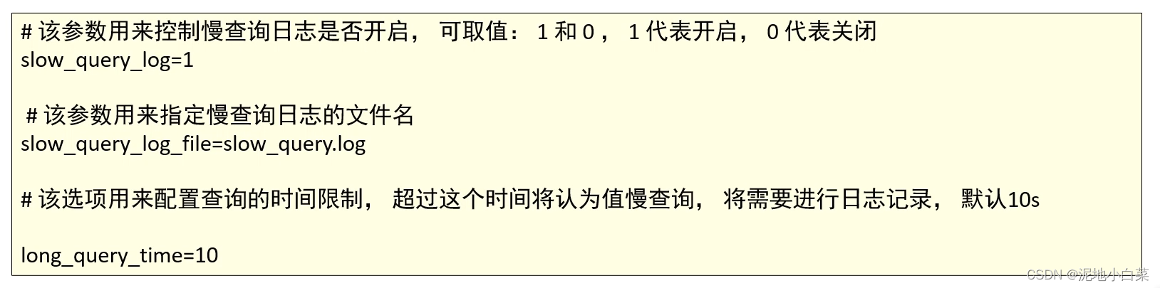 慢查询日志记录了所有执行时间超过参数long_query_time设置值并且扫描记录数不小于min_examined_row_limit的所有SQL语句的日志。long_query_time默认为10秒,最小为0,精度可以到微秒