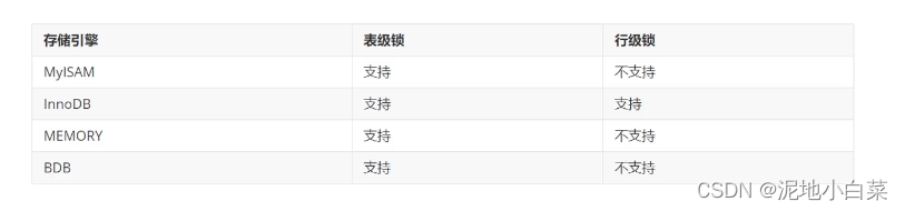 相对其他数据库而言,MySQL的锁机制比较简单,其最显著的特点是不同的存储引擎支持不同的锁机制,下表中罗列出了各引擎对锁的支持情况: