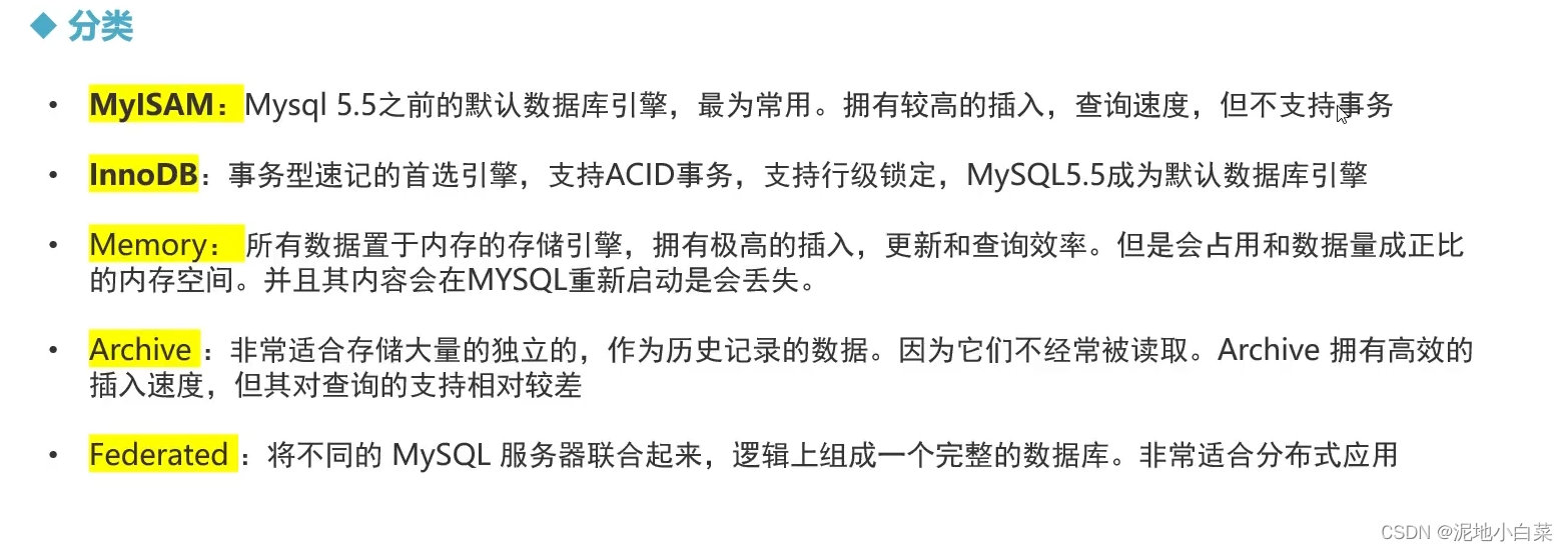 1.数据库存储引擎是数据库底层软件组织,数据库管理系统(DBMS)使用数据引擎进行创建,查询,更新和删除数据