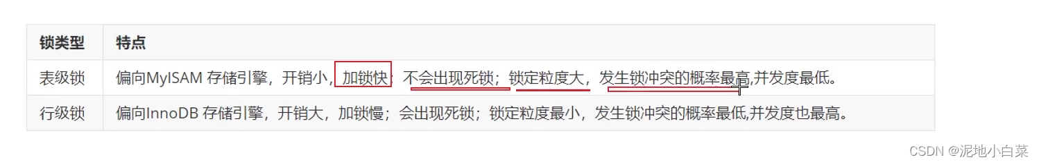 偏向InnoDB存储引擎,开销大,加锁慢;会出现死锁;锁定粒度最小,发生锁冲突的概率最低,并发度也最高。