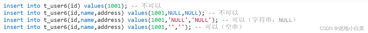 另外,设定NULL也是不可以的,这就是主键约束的特点,主键可以唯一标识一行数据