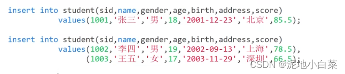 两种格式均可,注意SQL语句以分号结尾,所以SQL语句可以分行写,其次可以在一条insert语句中同时插入多个列表值,values只需要写一次,括号之间用逗号隔开,如图所示: