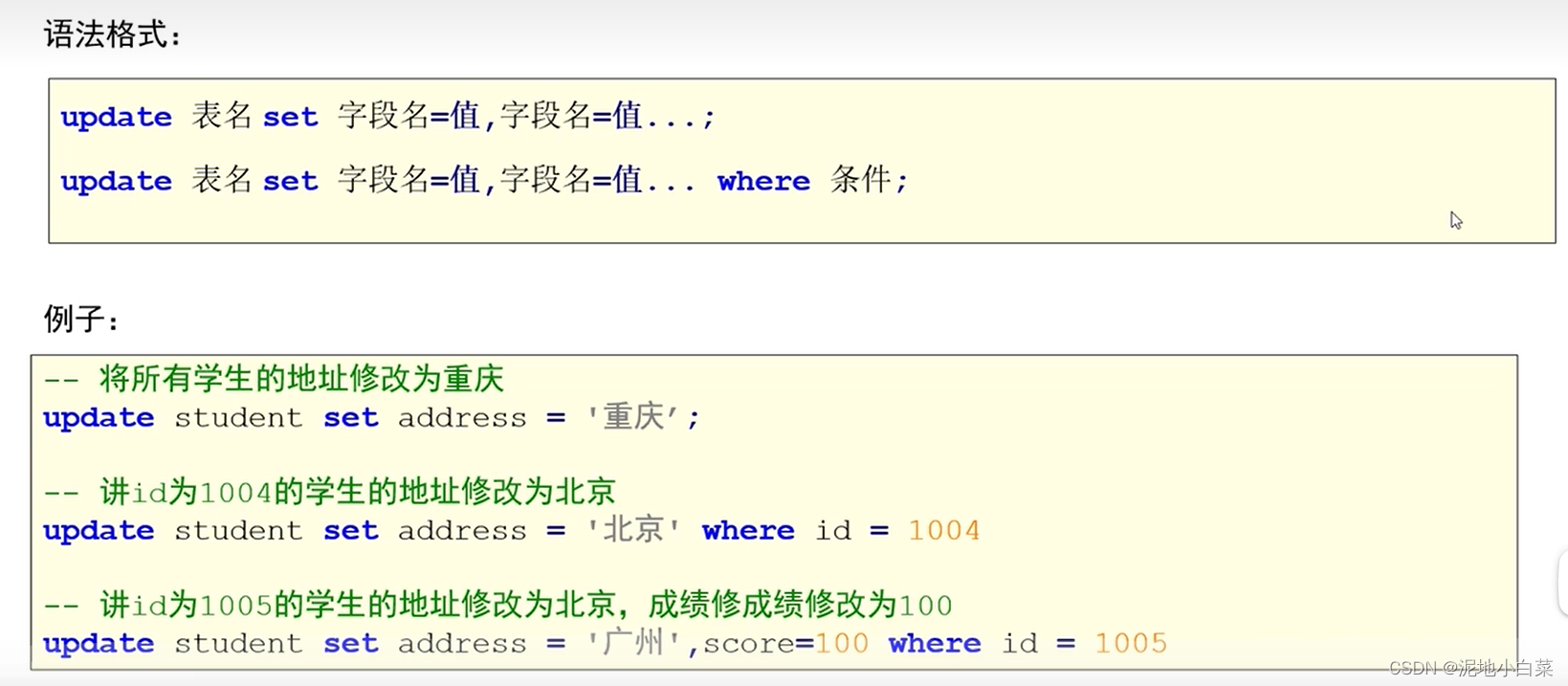 第一种方式会无脑的修改表中对应字段的所有属性值,一般不使用,通常用第二个限制条件where来达成数据修改的目的