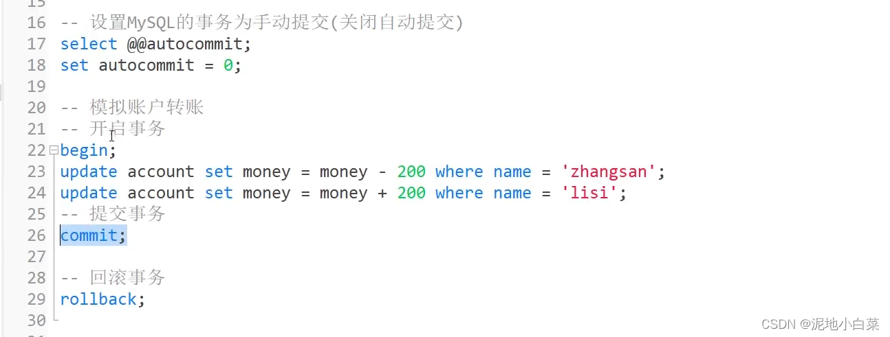 之前的所有SQL操作其实也有事务,只是MySQL自动帮我们完成的,每执行一条SQL时MySQL就帮我们自动提交事务,因此如果相要手动控制事务,则必须关闭MySQL的事务自动提交