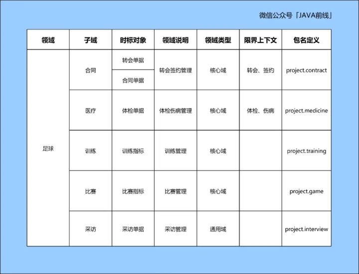 上文实例中领域是足球,子域包括合同、医疗、训练、比赛、采访,合同子域可以分为两个限界上下文:转会和签约,医疗子域可以分为两个限界上下文:体检和伤病。