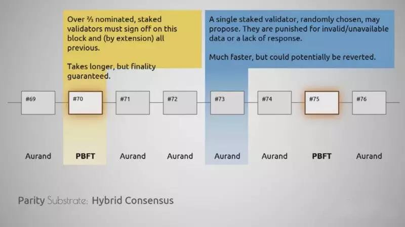 此外,你需要自己维护一个公钥集合,用于验证块的签名。块的签名验证与链使用的共识机制无关。 给块签名的私钥所对应的公钥应该放进这个公钥集合, 集合里的公钥可以变化,但每个块都由块创建时选择的集合进行验证。公钥集合里的公钥变化会产生的不同的公钥集合版本,以及由此引出的问题 Substrate 都会自动处理好。 公钥越少,安全性越低,公钥越多,验证耗费越多,这里要自己衡量。 通过签名验证后,块就被认为是「最终的」(即不可逆的)²。