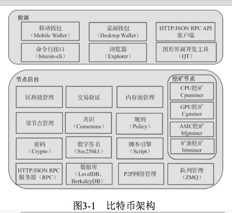 区块链有三个阶段,区块链1.0,区块链2.0,区块链3.0,其中每个阶段都有代表的产品,比特币作为区块链1.0的产品,其虚拟货币的去中心化被广为人知。如下图所示为区块链1.0版本框架: