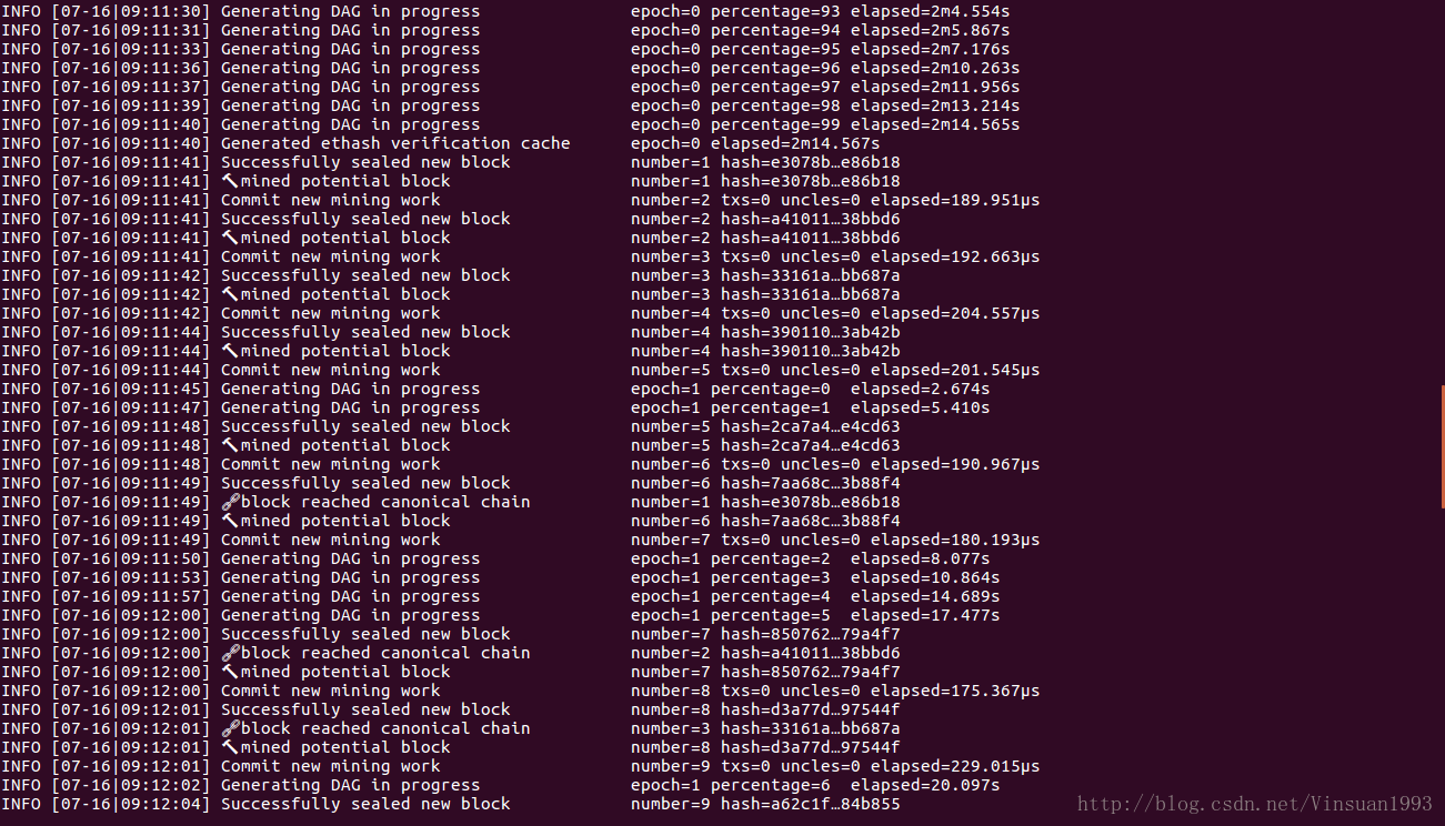 执行命令 tail -f geth.log 从而持续的输出以太坊的日志,生成区块的日志记录截图: