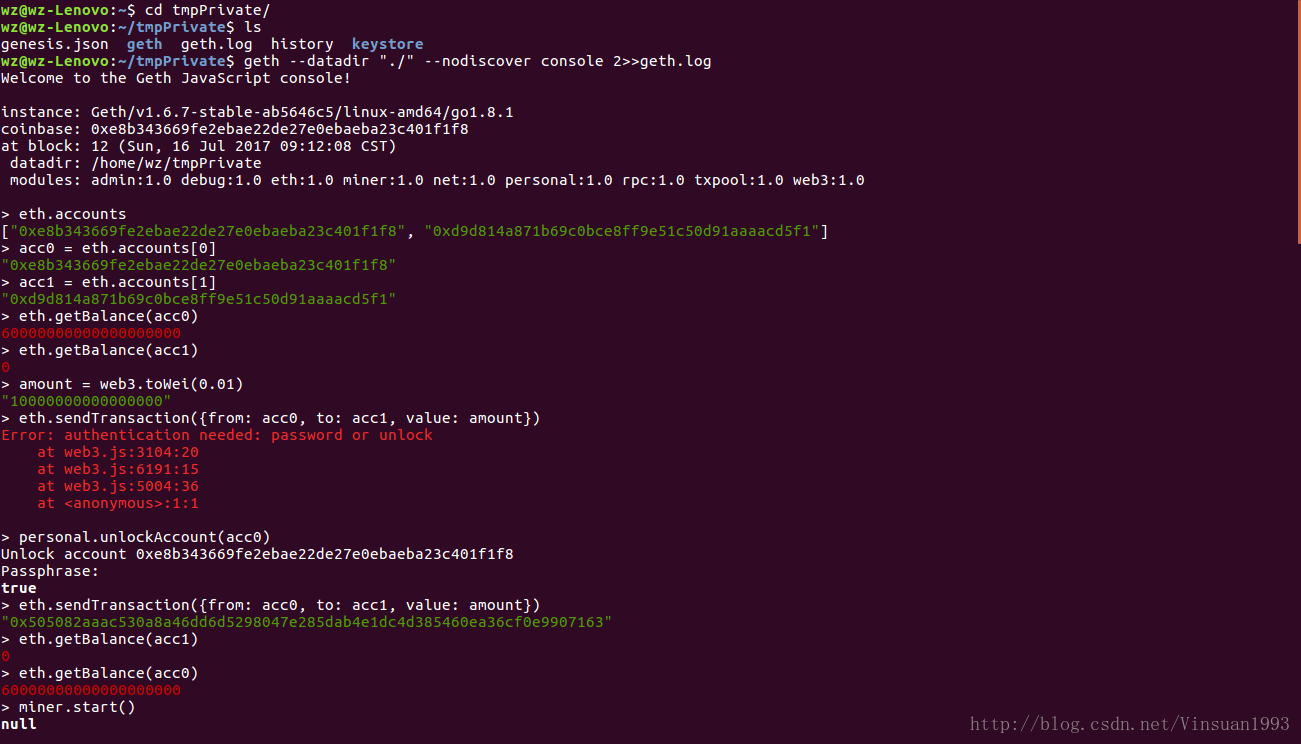 其中的代码 console 2>> geth.log 代表将控制台的一部分输出,输出到文件geth.log上去。