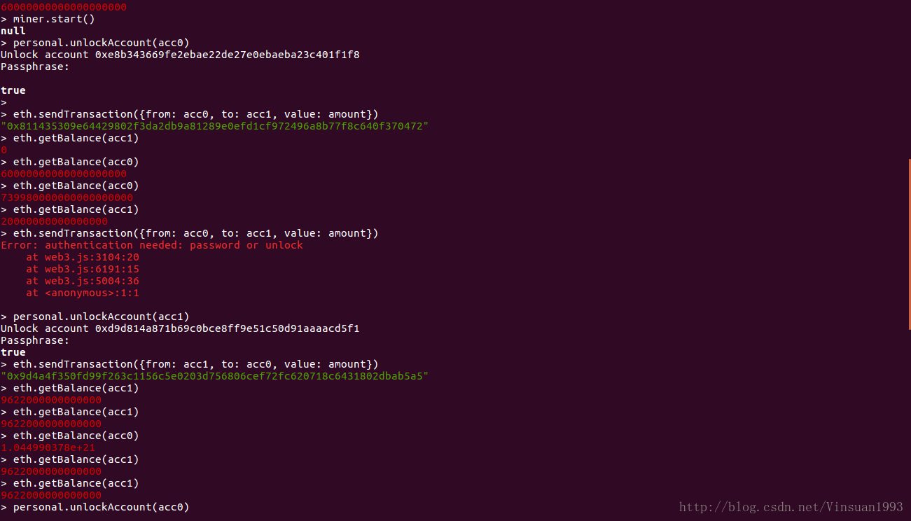 这个时候我们就需要执行 personal.unlockAccount(acc0) 并输入密码来解锁acc0才可。(如上图)