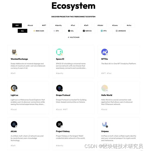 CyberConnect是一种社交图谱协议,允许dapp访问和使用用户提供的社交图谱数据。CyberConnect的生态系统非常强大,集成了Project Galaxy、Mask Network、Light.so、Grape.art、NFTGo, Metaforo、zklink等很多Web3应用。