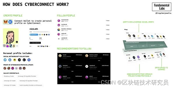 CyberConnect的社交图谱分为两个部分:1)关注按钮;2)关注和关注者列表。Web3应用程序可以直接插入CyberConnect的社交图谱模块来开发自己的应用程序,这可以帮助解决冷启动问题,还可以将数据所有权还给用户。因此,用户可以使用自己的社交图谱在不同的应用程序之间切换。CyberConnect的解决方案允许用户在所有应用程序中拥有更全面的身份。