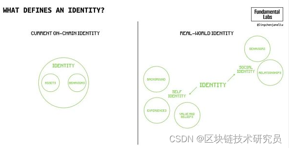 基于稀缺性、声誉或真实性的市场需要与个人绑定的身份。“身份”一词有多重含义:一是表示一个人不同于另一个人的身份证上的身份,二是表示一个人和另一个人之间关系的社会地位或状态。到目前为止,基于地址的身份只关注状态,特别是显示地址所持有资产的合约状态。要构建更丰富的社交应用,必须要有显示人类之间的社会关系的关系性身份。