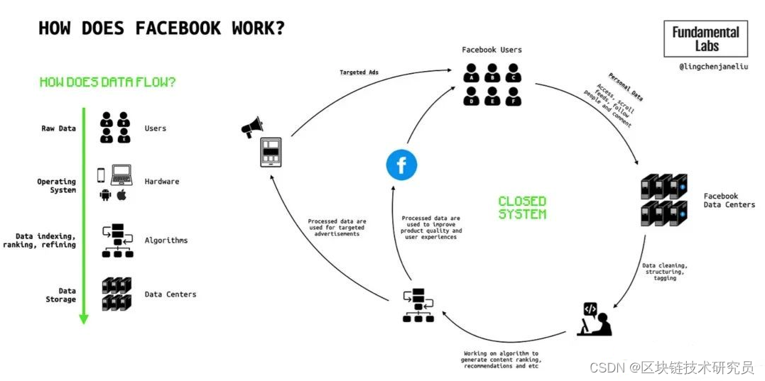现有的主流互联网平台是建立在聚集用户和用户数据的基础上的。随着这些平台的发展,它们提供价值的能力也在增长。平台网络效应使那些占主导地位的平台保持领先地位。主流社交网络平台的用户行为数据帮助它们优化算法,使它们的内容feed和广告定位明显优于其竞争对手。亚马逊通过对利润率和消费者需求的分析获得了全面的数据来了解客户需求,从而可以优化其配送物流并开发自己的产品线。