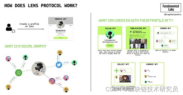 Lens Protoco是一个可组合的、去中心化的社交图谱。社交应用包括用户档案、关注者、帖子、评论、分享和点赞。这些组件定义了基本的数据布局和数据之间的关系,比如谁关注谁或者谁发布了什么内容。