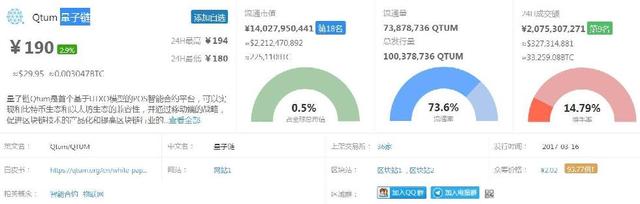 目前,Qtum量子链市价人民币190元左右,较发行价上涨90倍,流通市值140亿元,全球排名18名,市值中等。