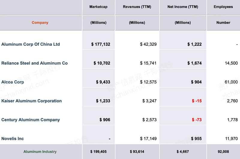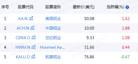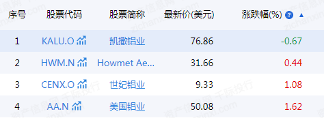 全球的中国主要企业有凯撒铝业[KALU.O]、Howmet Aerospace[HWM.N]、世纪铝业[CENX.O]、美国铝业[AA.N]。