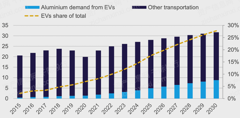 图 电动汽车未来市场份额以及对铝的需求增长情况