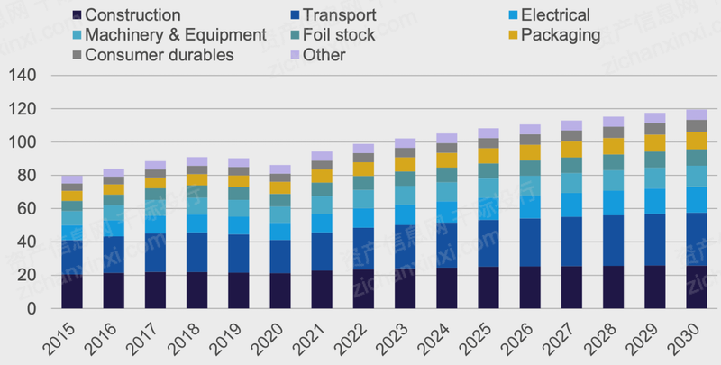 脱碳政策和可持续发展理念的盛行预计将对铝需求产生重大影响。可再生能源和电动汽车(EV)的采用,以及包装和建筑行业可持续解决方案的实施,将为铝行业带来重大机遇。预计未来十年铝总消费量将增长3330万吨,从2020年的8620万吨增长到2030年的11950万吨。预计约75%的需求增长来自运输(35%)、电气(16%)、建筑(14%)和包装(10%)部门。