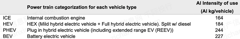 图 不同动力来源的汽车可使用到的铝