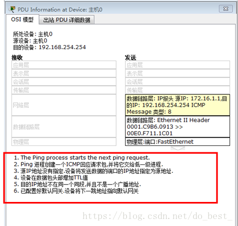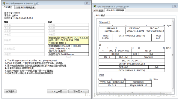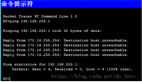 步骤1中,目的IP与主机不在同一网段,需要通过网关找到下一跳地址,而在该步骤中,如果地址设置为192.168.253.1,直接在命令行输入ping指令,很明显会出现错误,因为中间路由器的接口FastEhernet0/0、0/1的IP地址还没变化,与当前主机设置的IP地址不匹配,因此会出现上述现象;