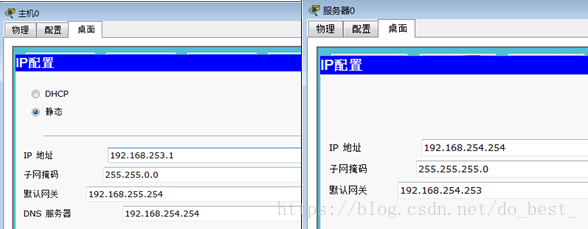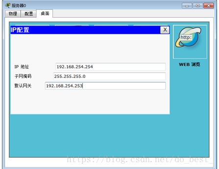 ① 对服务器配置。单击Server0 选中Desktop 标签,再单击IP Configuration,在相应的